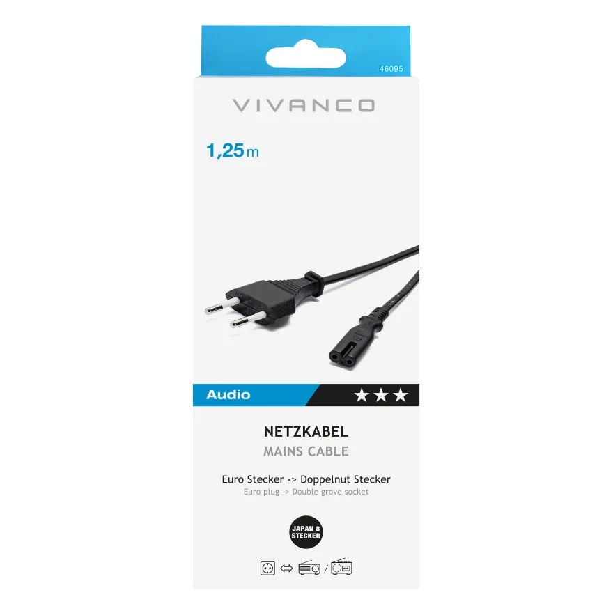 Das VIVANCO Netzkabel Stromkabel mit Eurostecker auf IEC C7 Buchse ist die ideale Lösung für eine zuverlässige Stromversorgung Ihrer elektronischen Kleingeräte. Ob TV, Spielekonsole, Receiver oder Netzteile – dieses Kabel versorgt Ihre Geräte zuverlässig und sicher mit Energie. Durch seine universelle Kompatibilität wird es zu einem unverzichtbaren Zubehör im Alltag.